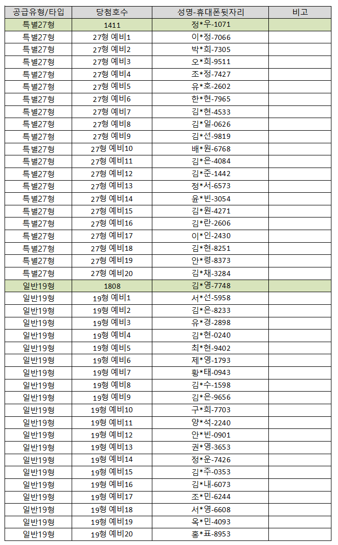 추가모집 일반19형 1세대, 특별27형 1세대 당첨자 발표